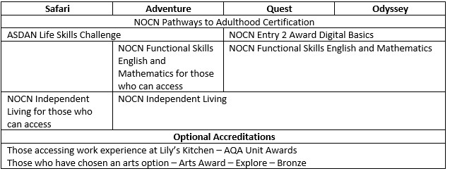 Students in Safari have opportunities embedded into their curriculum to access meaningful work opportunities. In Adventure they have work certified by ASDAN Life Skills Challenge. In Quest and Odyssey students follow the NOCN Preparing for Further Learning or Employment accreditation.