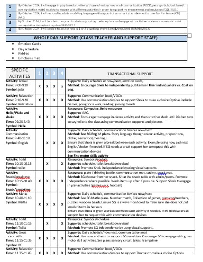 An example of a student who is accessing the main lessons within the class. Students who have these individualised timetable are able to access group learning in the afternoon, however the approach relating resources, timings and language used are amended to meet their individual SCERTS outcomes and communicational needs.