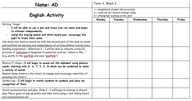 Where students can communicate their feedback, they ae encouraged to reflect informally on positive aspects of their learning and areas for improvement. For students who are unable to verbally articulate feedback, staff use behavior monitoring such as SLUETH, ABC tally charts and general observations of behaviour throughout the school day to assess engagement and identify areas of success or challenges.