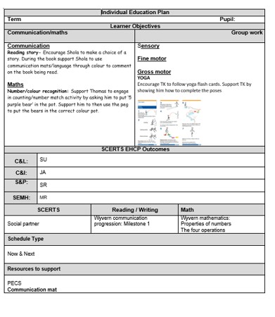 Morning session: Focus on SCERTS and academic learning (Maths and English), supported via visual schedules, structured sensory circuits or communication activities to support emotional understanding and regulation.